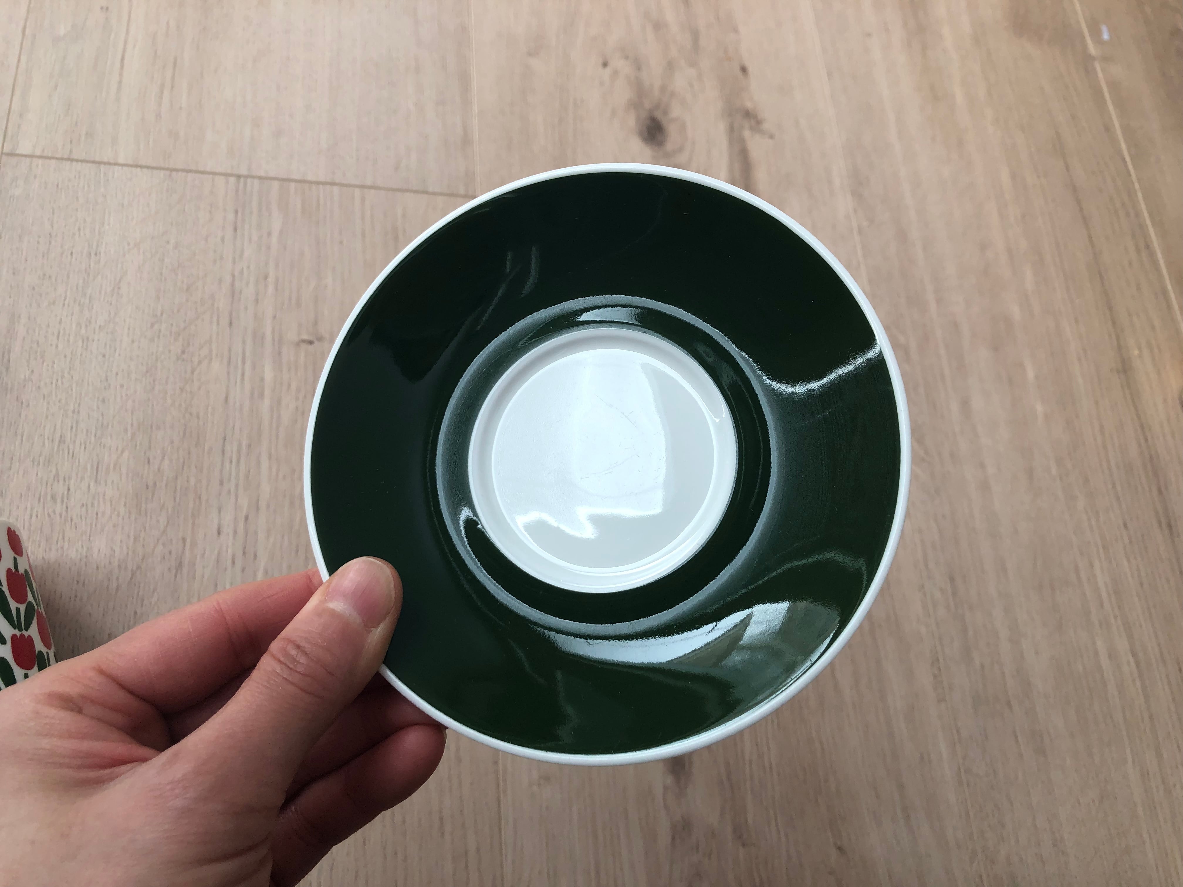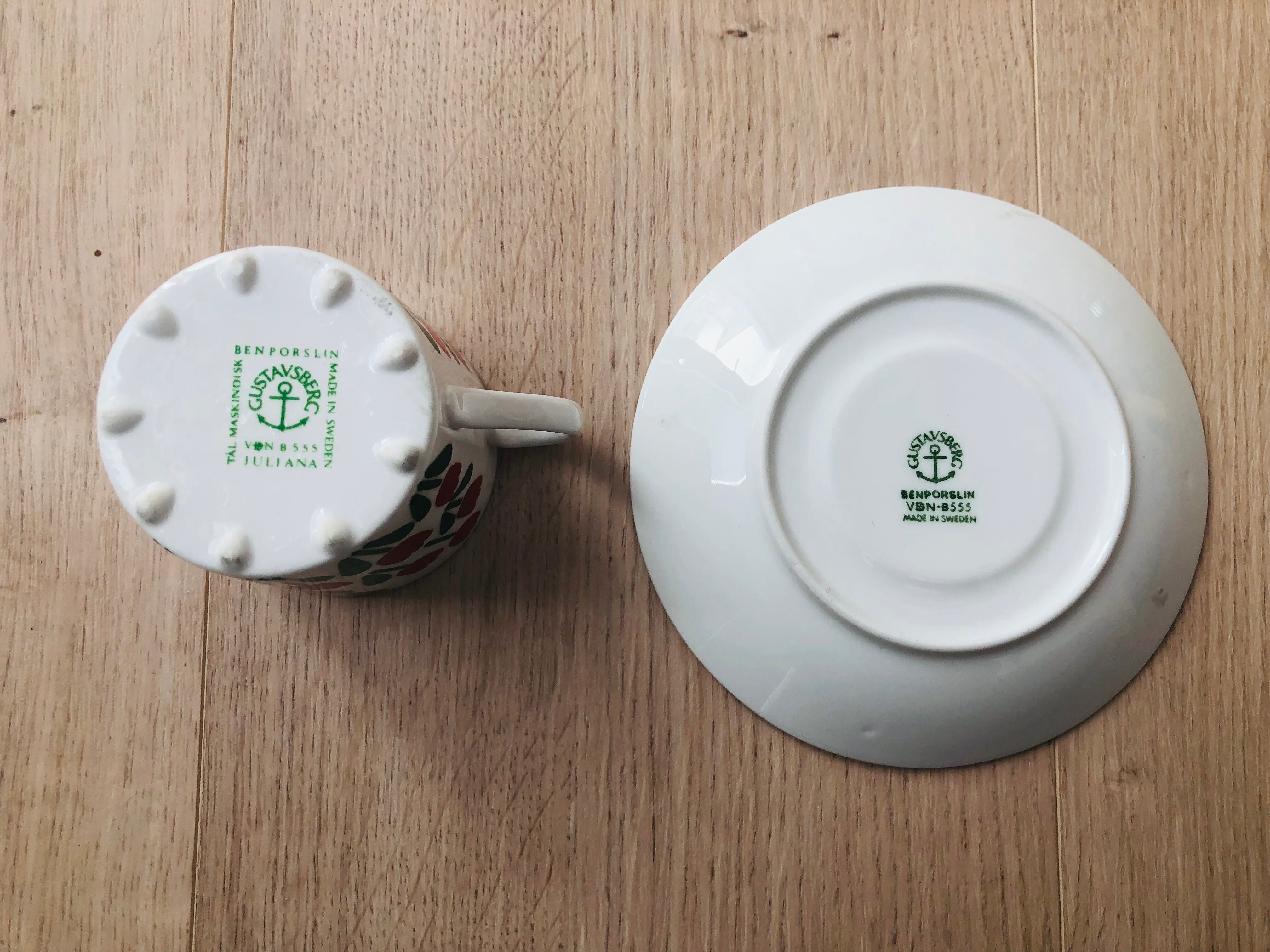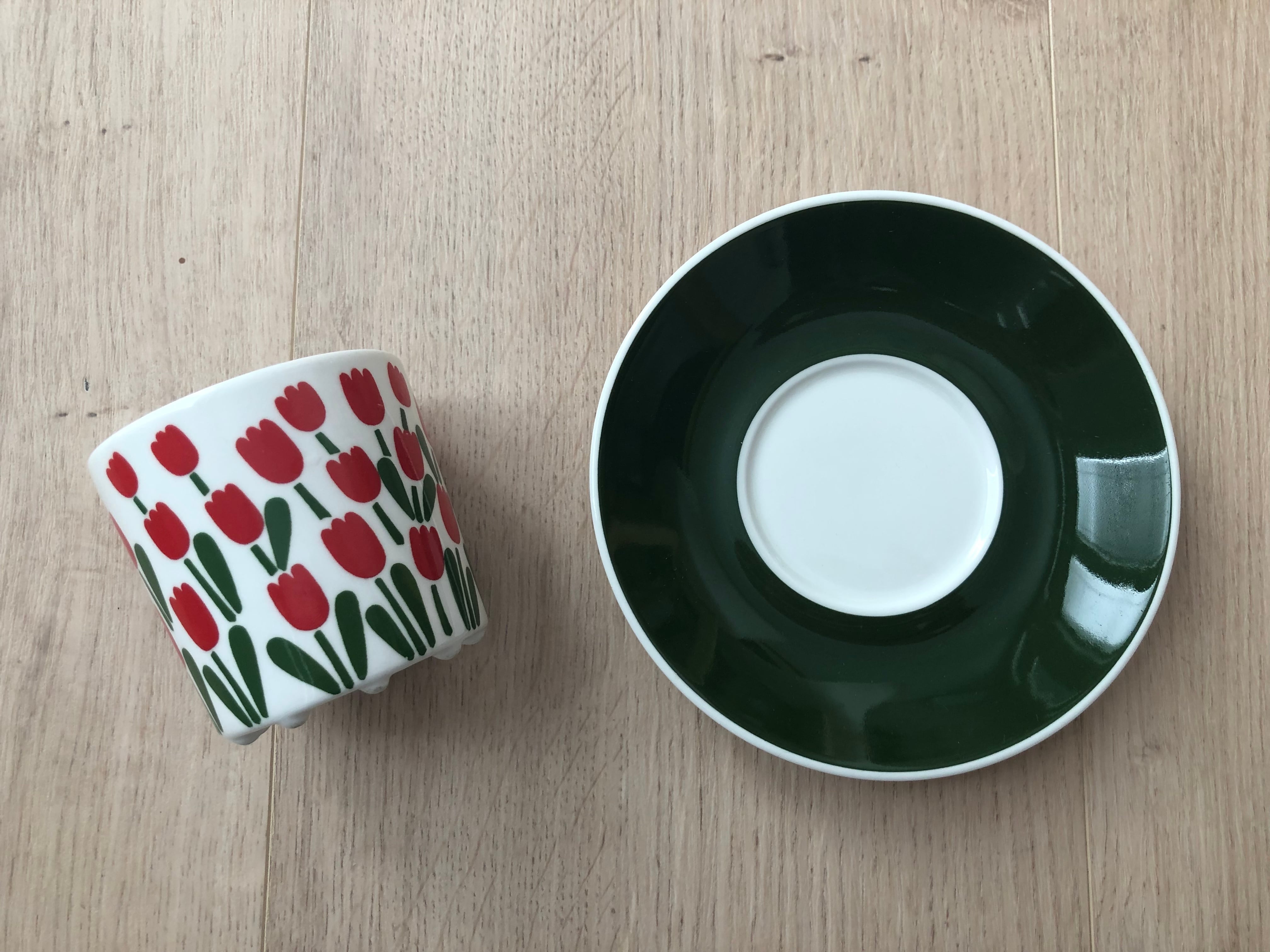 グスタフスベリよりかわいらしく、躍動感のあるチューリップのお花が一面にデザインされたジュリアナシリーズよりコーヒーカップとソーサーのセットになります。落ち着いたモスグリーンの葉っぱとソーサーがきゅっと全体を引き締めてくれ、かわいすぎないデザインになっています。フォルムはEmmaやTahitiなどと同じです。現在ではなかなか出回ることは多くない希少なシリーズかと思います。
